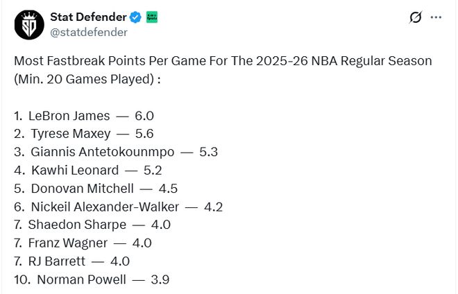 北京时间1月17日,据Stat Defender的数据显示,在全联盟本赛季至少出战20场比赛的所有球员中,詹姆斯的场均快攻得分(6.0分)排在第一位,马克西和字母哥分列二三。具体排名如下,括号内为场均快攻得分——