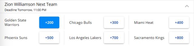 北京时间1月18日,锡安最新下家赔率出炉,勇士高居首位,他们成为了这位鹈鹕球星的头号热门下家。锡安下家赔率目前排在第1-6位的依次是勇士、公牛、热火、太阳、湖人和国王。随后美记James Piercey晒出了一份4换1的交易方案,认为这是双赢的选择。