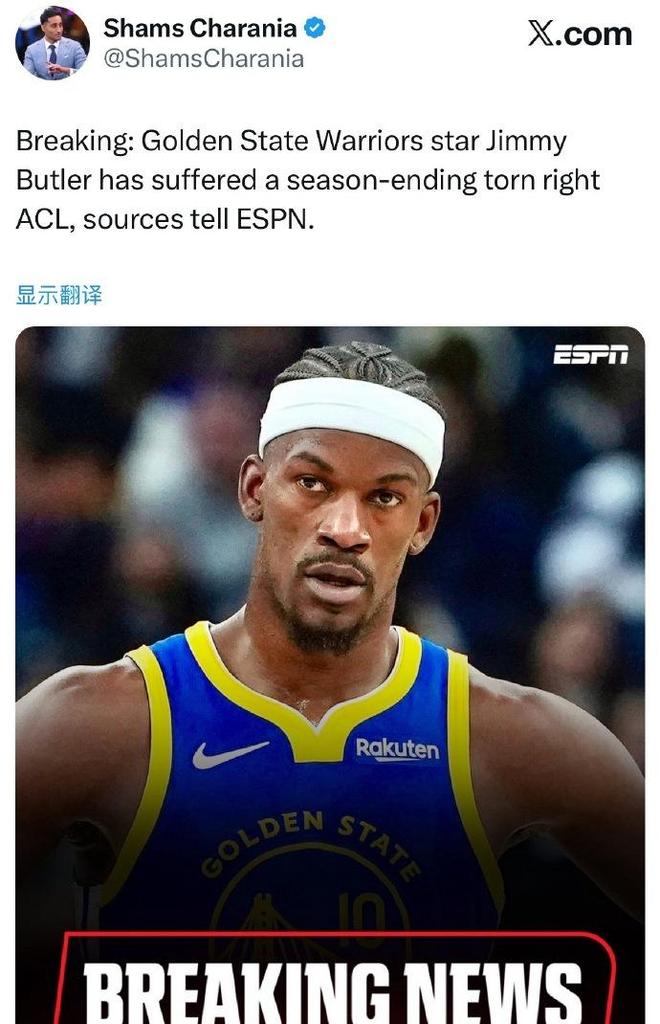 之后,据ESPN名记Shams报道,多位消息人士透露,勇士球星吉米·巴特勒遭遇前十字韧带撕裂,赛季报销!