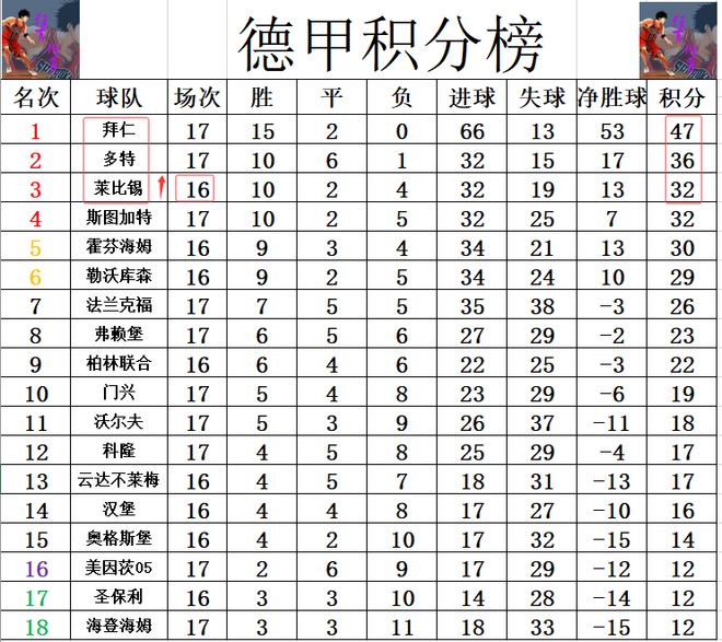 积分榜方面,拜仁逆转击败科隆后夺取3连胜,再次将和第2名的多特差距拉大到11分。莱比锡今天赢球后,少赛一场的情况下凭借净胜球优势超过斯图加特重回前3,落后第2的多特4分。