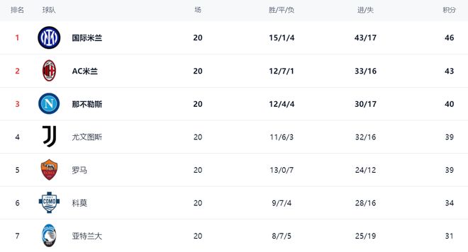 这场比赛也影响了争冠格局。国际米兰依然占据榜首位置,战绩是15胜1平4负,拿到46分。AC米兰赢球之后,总积分是43分,排名第2。前2的球队之间相差3分。显然,国际米兰和AC米兰这两支球队是夺冠大热门。卫冕冠军那不勒斯有些掉队了,只拿到40分排名第3。尤文图斯则以39分排名第4。