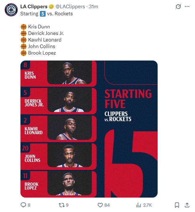 快船:邓恩、琼斯、莱昂纳德、科林斯、洛佩斯;