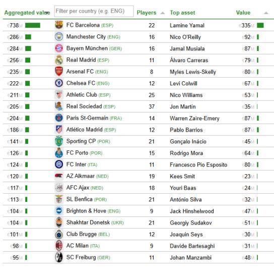 CIES青训球员身价榜:巴萨7.38亿欧断层领先,曼城2.84亿第二